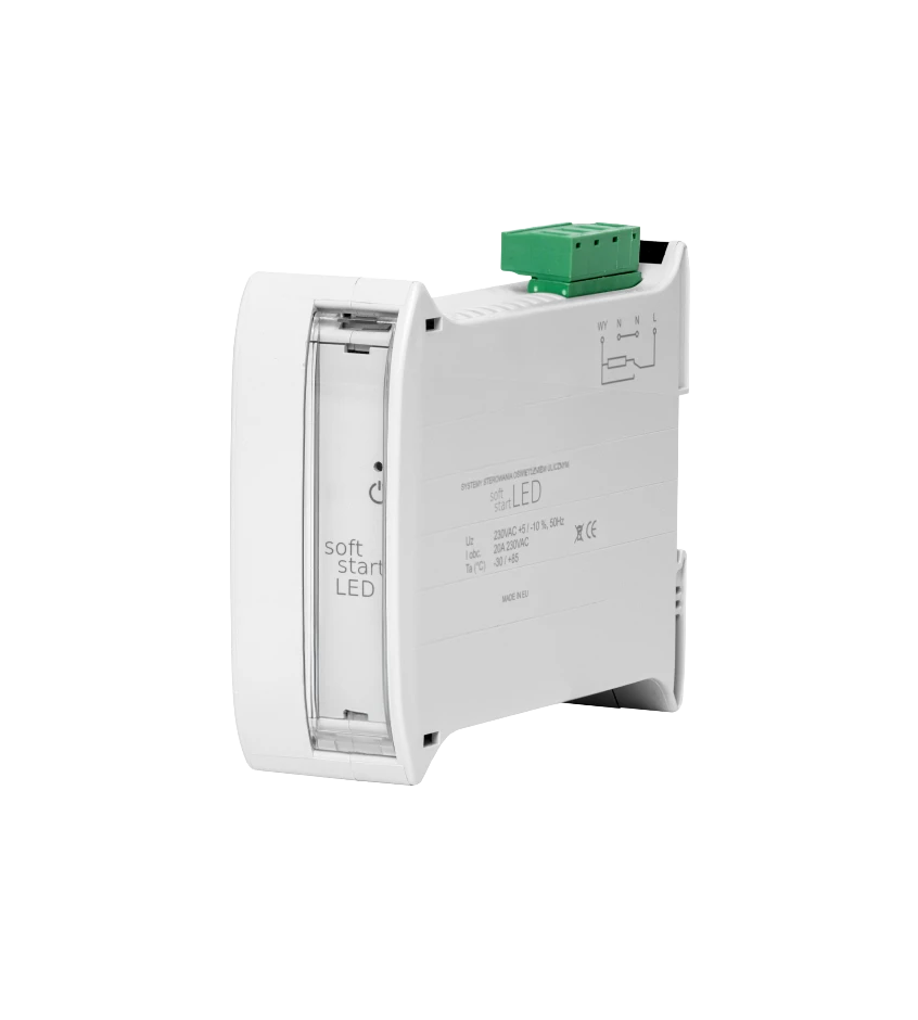 Softstart for LED streetlights: Limits inrush current (20A, 1-phase) to protect components and extend luminaire lifespan. DIN rail (TH35) mountable.