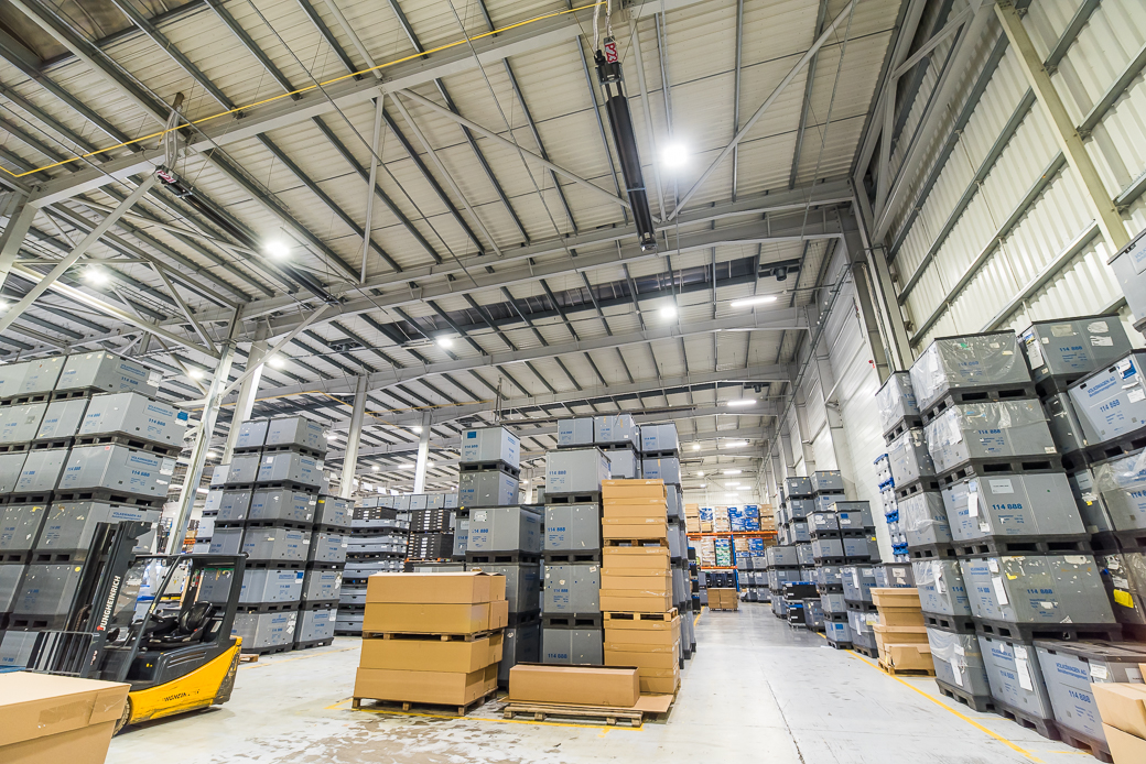 Modern LED luminaires in the Geberit warehouse.