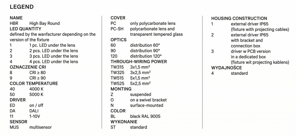 | Name | Produktcode | Leistung [W] | Lichtstrom [lm] | Effizienz [lm/W] | Steuerung | Farbtemperatur [K] |